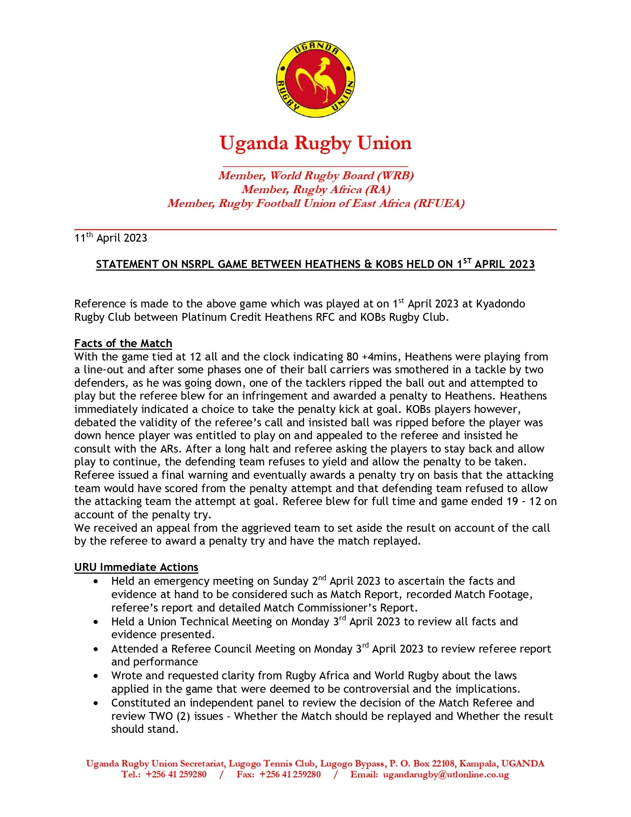 The Uganda Rugby Union will hold its Annual General Meeting on Sunday 25th April 2021 at the Lugogo Arena. The invite only event will be attended by 30 members physically and on zoom. AGM AGENDA: 1.Opening prayer 2. Matters arising from the 2020 AGM minutes 3.Presentation of 2020 Executive Committee Report 4.Presentation of 2020 Audited […]