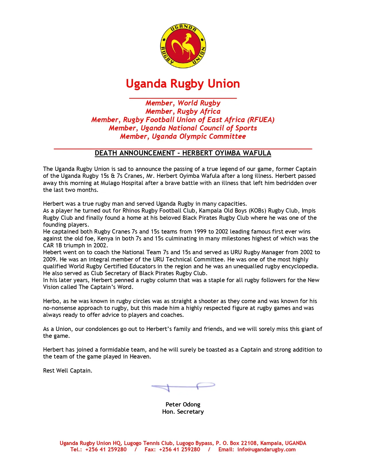 There has been a reported positive COVID-19 case with one of the players in the Rhinos RFC camp. As such all the players who attended that session have become contacts and will all require to undergo tests to determine their status. The Uganda Rugby Medical Society as per the COVID-19 Protocols are monitoring […]