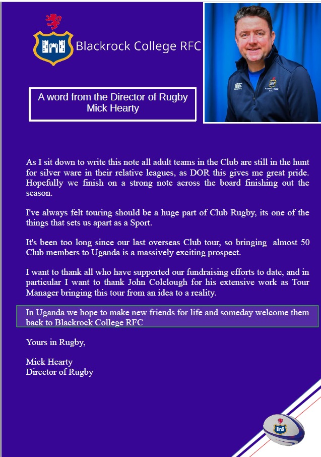 The Irish BlackRock RFC last played in East Africa in 1971. This tour marks their first return to East Africa and particularly to Uganda since that time.