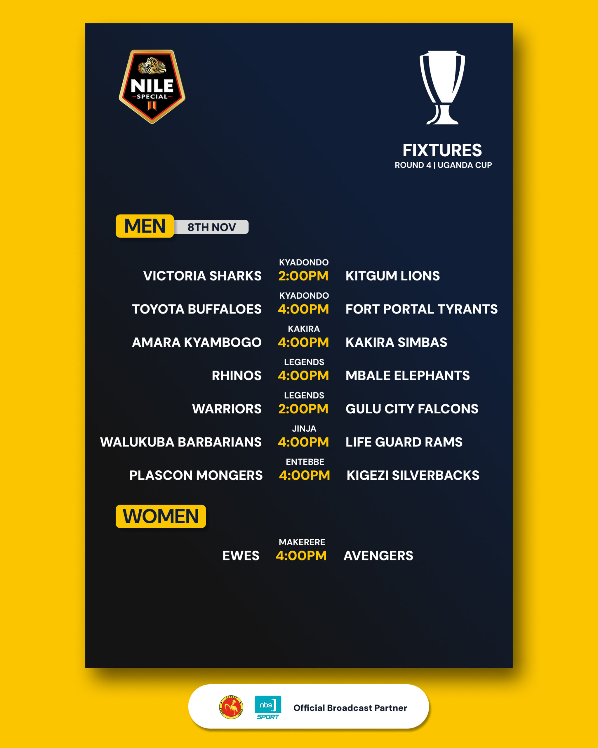 The Uganda Cup continues tomorrow, Saturday, 8th November, with a full slate of Round 4 fixtures across 6 venues.
