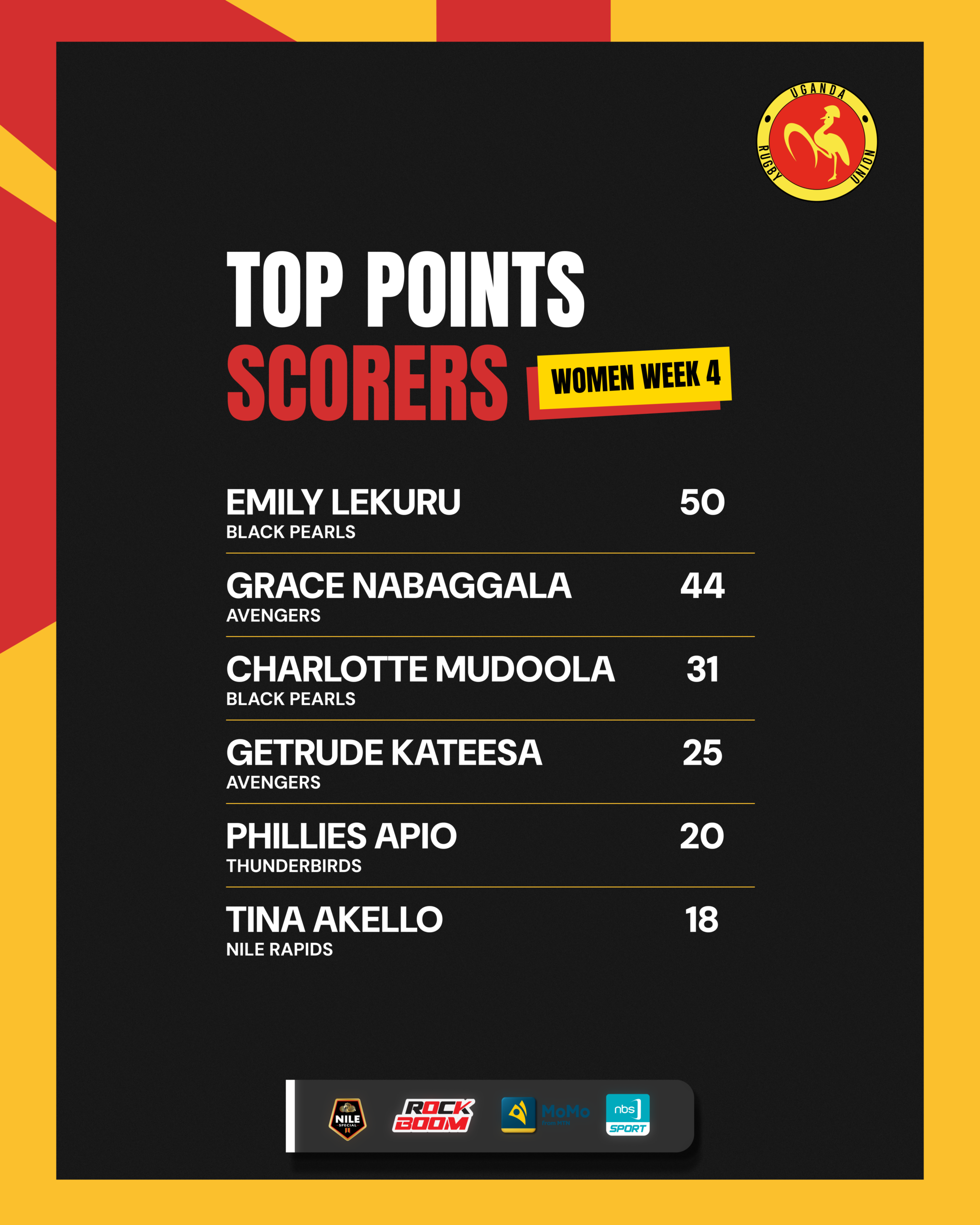 Four game weeks in, Black Pearls’ Emily Lekuru leads with 50 points, her powerful running and line breaking abilities make her the premiership’s most dangerous attacker so far. Avengers’ Grace Nabaggala follows with 44 points, her electric pace and sharp finishing are a key weapon. Black Pearls full-back Charlotte Mudoola sits third with 31 points, her reliability off the tee, and attacking instincts drive her team’s momentum. The players are getting better, and so is the competition.